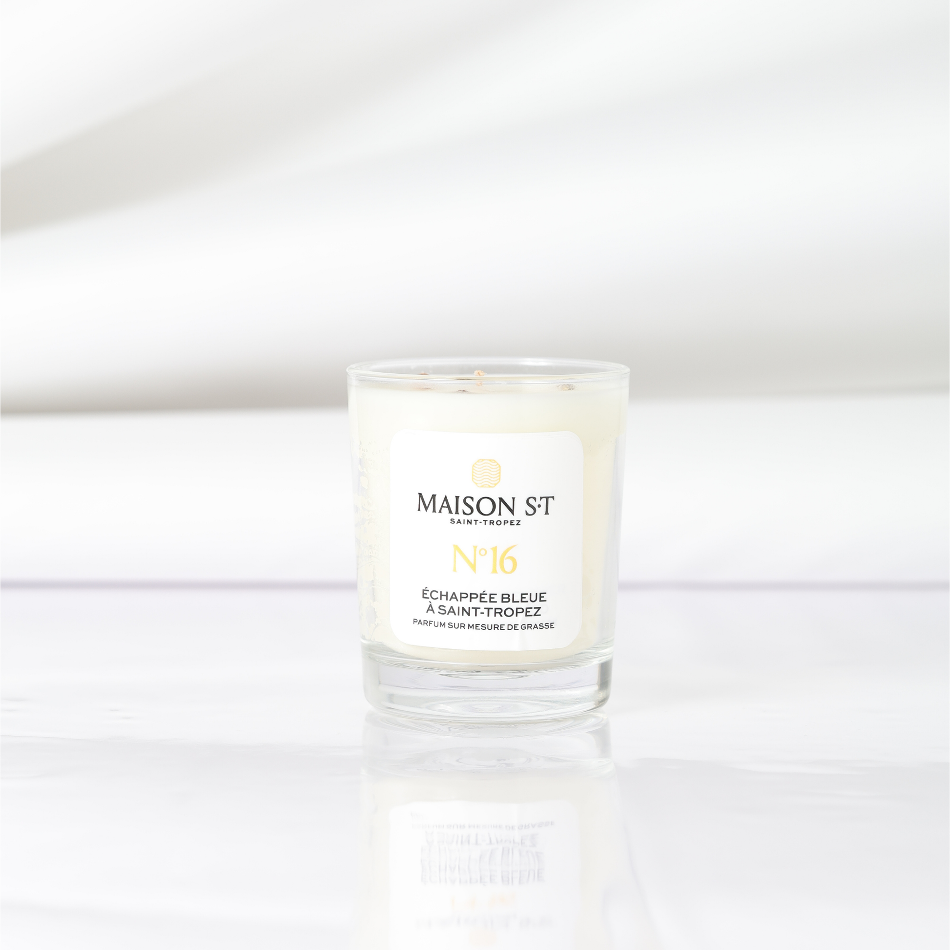 La bougie n°16 « Échappée Bleue à Saint-Tropez » évoque la fraîcheur vivifiante des brises marines et la sérénité des horizons infinis. Elle diffuse une atmosphère unique, à la fois tonique, apaisante et élégante, qui invite à l’évasion.